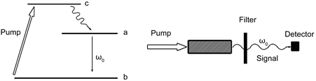 Figure 3. From Ref. [32] . A typical experiment of superradiance surveillance. (a) The energy level scheme: the ground level―b with an upper excited state―с and an intermediate excited level―a; (b) The scheme of the experimental setup.