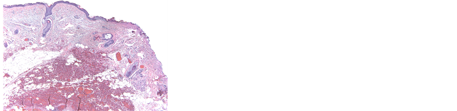 Figure 5. H & E stain histologic section at 40× magnification. Note uniform depth of 0.15 mm of diathermy in the area next to the edge of the excised wound using continuous wave mode.