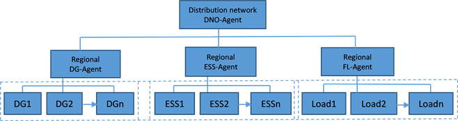 In this paper, the characteristics of MAS communication and decision ordnance are adopted. A multi-agent structure for coordinated control of DG, ESS and flexible loads in an active distribution network is proposed. The control structure is shown in Figure 1. The MAS hierarchical structure of multi-agent model is used to control the DG, energy storage and load, and the hierarchical multi-agent model is shown in Figure 2.