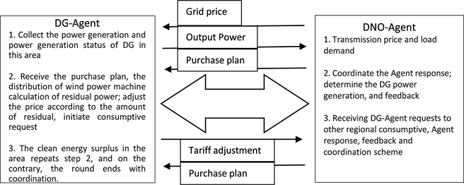 At the initial moment, DNO sends the grid price and system load demand to DG-Agent, DG-Agent collects the power generation status and output power of controlled DG, Feedback to DNO for its own responsiveness; DNO takes the system power balance as the constraint, coordinates the Agent response of each region, determines the purchasing power and feedback DG-Agent; DG-Agent accept the remaining amount of distribution power of wind machine for calculating purchasing power, it maximizes the implementation of renewable energy generation in the region, stimulate the active distribution network storage and load response efforts. According to the remaining power of wind turbines, DG-Agent adjust the price of electricity, Initiate the consumptive request to DNO; DNO coordinates other regional Agent to meet the demand response of DG-Agent, and feedback the coordination purchase plan to DG-Agent. The DG-Agent accepts the response scheme, and if the renewable energy is left within the security constraint, the consumer request is initiated again.