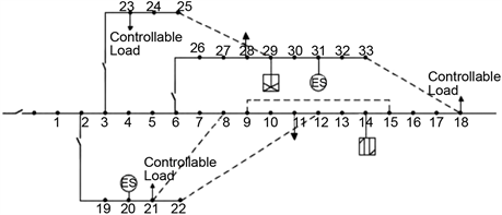In this paper, an active distribution network system with IEEE33 nodes is used. The validity and effectiveness of multi-agent operation control model and strategy for active power distribution network are analyzed and verified, the structure of the active distribution network is shown in Figure 5, and the installation information of DG and energy storage is shown in Table 4. In order to prolong the service life of the energy storage device, set , The initial state of stored energy is .