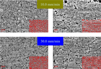 In this work, to quantify the porosity distribution, a number of images acquired through scanning electron microscopy were extensively analyzed using a segmentation approach developed using ImageJ and Adobe Photoshop CC (Adobe Systems Inc., USA). This research aims to understand the effect of extrusion velocity on the microstructural variations in the sheared region (i.e. at the die wall) compared to the unsheared region (radial center of the extrudate).