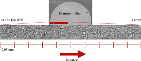 detector was used to provide a high contrast between different phases in the sample. Images were in indexed color mode (uses up to 256 colors) with 1024 × 768 pixels and 8-bit channel. Images were obtained sequentially for each extrudate from the die wall (sheared region) to the center of the cross section with a 0.03 mm step using the stage navigator in the FESEM. This is shown in Figure 3. For the sake of simplicity, we assumed that the pore distribution is axisymmetric because an axisymmetric die geometry was used.