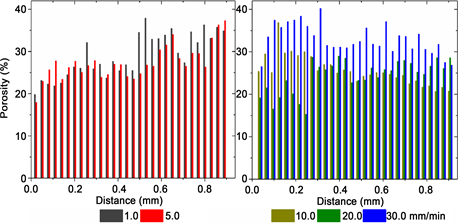 Figure 8 shows a histogram of porosity distribution from the die wall (distance is around 0 mm) toward the center of the extrudate cross section (distance is around 0.9 mm). The spatial variation is an average of two samples for each extrusion velocity. Both samples were of the same formulation and extruded at same extrusion velocity under a controlled environment.