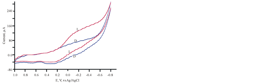 Figure 2. CV of FTO/PEDT in phosphate buffer pH 6 L (light), D (Dark).