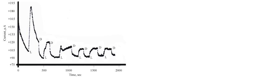 Figure 5. Photolysis FTO/TiO2/PEDT thin film in Acetate buffer pH 6 containing 10 mM [Fe(CN)6]4− (a) at −0.50 V vs Ag/AgCl (b) at −0.30V vs Ag/AgCl (L and D donate to Light and dark).