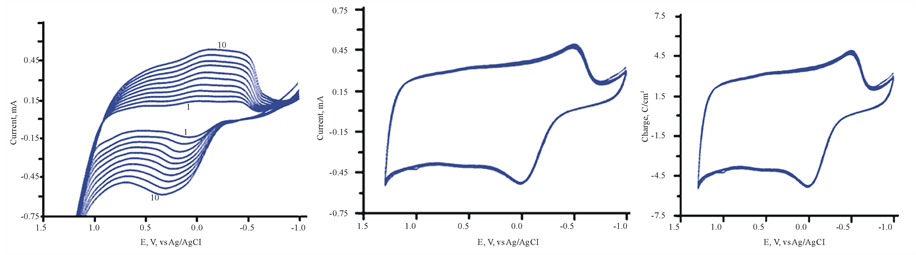 The cyclic voltammetry (CV) of ITO/MoO3/PEDOT assembly in 0.5 M H2SO4 (50% dioxane/water) mixture is displayed in Figure 8 (Trace 1). Occlusion of MoO3 into PEDOT sharply increases the capacitive current and stored greater amount of charge. This observation is supported by the fact that Trace 2 in this figure is the CV for the ITO/PEDOT in the electrolyte only as also illustrated in Figure 1(b). The comparison displayed in Figure 8 confirms the fact that MoO3 is strong electron storage capacity. The large amount of charge represented by the area of Trace 1 compared to that Trace 2, clearly recommend that the MoO3/PEDOT assembly can enhance energy storage in both battery and capacitor charge.