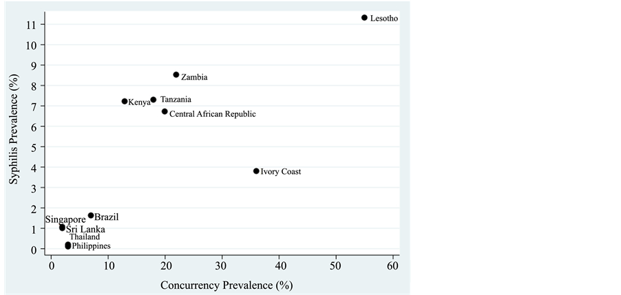 To overcome the problems of comparability with different datasets using different methodologies and definitions of concurrency, we used one of the only multinational surveys that assesses concurrency using the same methodology. These are the WHO/Global Programme on AIDS (GPA) sexual behavioural surveys conducted in 1989/1990. All 11 countries that performed these surveys between 1989 and 1990 and asked questions about concurrency are evaluated here [18] [19] . All these surveys followed WHO/GPA protocols. These included that national probability samples of the general populations aged 15 to 49 were utilized. In two cases, Manila and Rio de Janeiro, the samples were representative of these large cities rather than being nationally representative. All samples were selected based on the probability principle with various designs depending on national factors. A two stage sampling strategy was the norm, with census enumeration areas as the first stage and households as the second. The sample sizes were typically 1000 - 3000 men and women. Response rates were high in all cases. The variable for concurrency was derived from the question “Do you now have one or more than one spouse/ regular partner?” The concurrency variable we used in our analysis was the percentage of men 15 - 49 year old who had more than one sexual partnership active at the time of the survey. Only 7 of the countries surveyed asked the women if they had concurrent partners. As a result, we limited our analysis to male concurrency (defined below). We related point-concurrency prevalence to estimated syphilis prevalence.