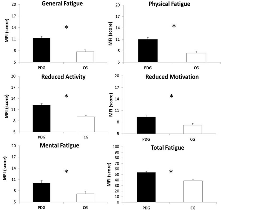 Figure 1. Means and standard deviations of the score on general fatigue, physical fatigue, reduced motivation, mental fatigue, reduced activity dimensions and total score of Multidimensional Fatigue Inventory (MFI) for the Parkinson’s disease (PDG) and Control Groups (CG). *Significant difference p < 0.001.