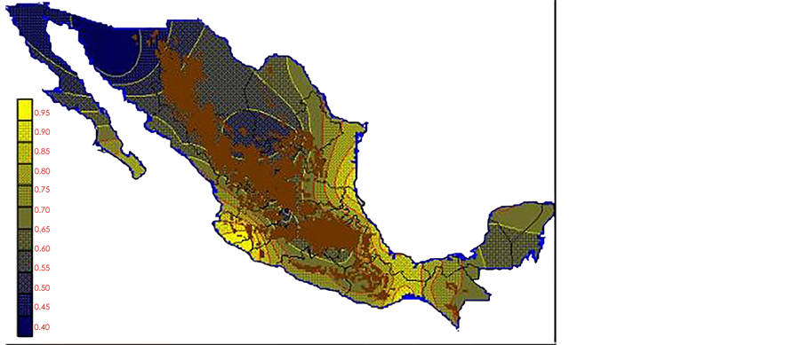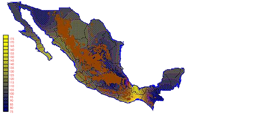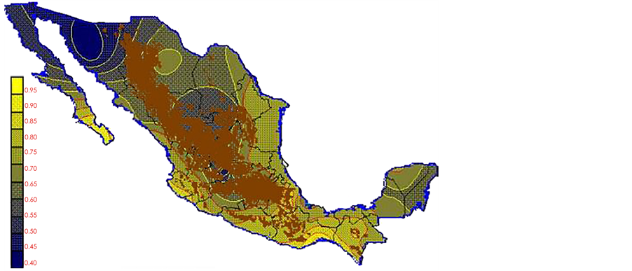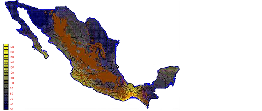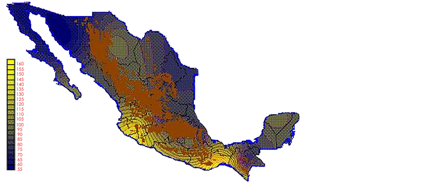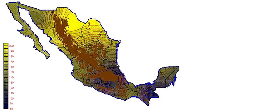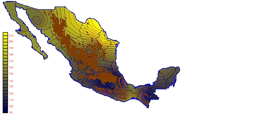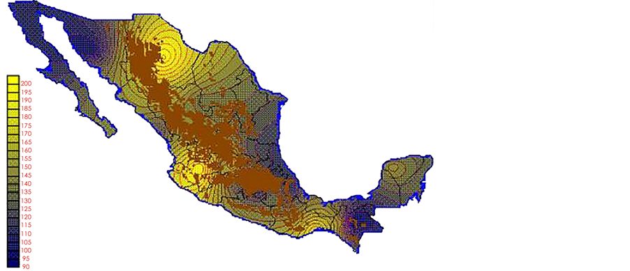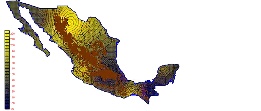 With the values from Table 3, isocurves and maps of Kp pan evaporation and ETo were elaborated and standardized for all the country, by interpolating the latitude, longitude, Kp and ET data respectively (as a triad of values) with a Kringing grid method. With this data, a rectangular calculation mesh (rows and columns) was established. The grid method produces a regulated arrangement of the Z (Kp or ET) values from the XYZ (latitude, longitude and Kp or ET) irregularly spaced. The terms “irregularly spaced” mean that the points do not follow a particular pattern over a map, e.g. in practice many “spaces” were left without any data, which the method (Kringing) estimates by taking as a reference the closest values, filling these spaces by interpolation. The Kringing method has a mean weighed interpolation algorithm and incorporates a linear variogram model. The variogram is used to determine the local vicinity of the observations when an interpolation is performed in each node of the grid. The illustrations Figures 1-12 show the Kp estimations for each month, normalized for Mexico.