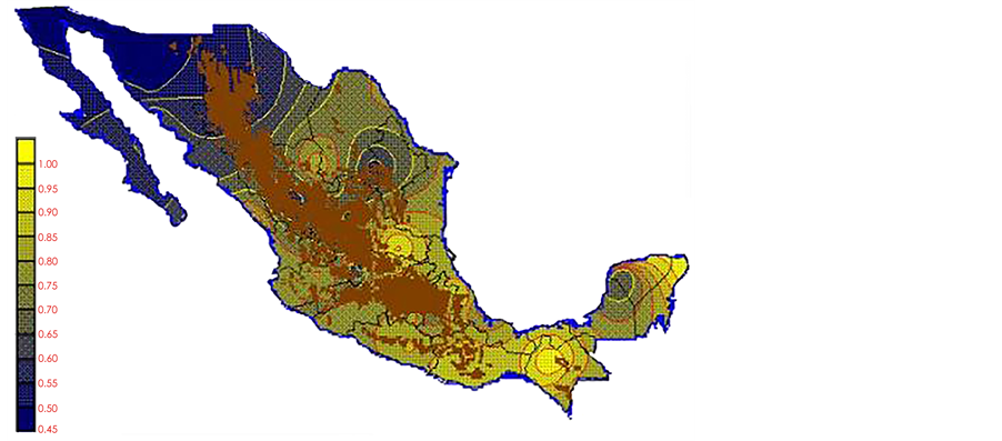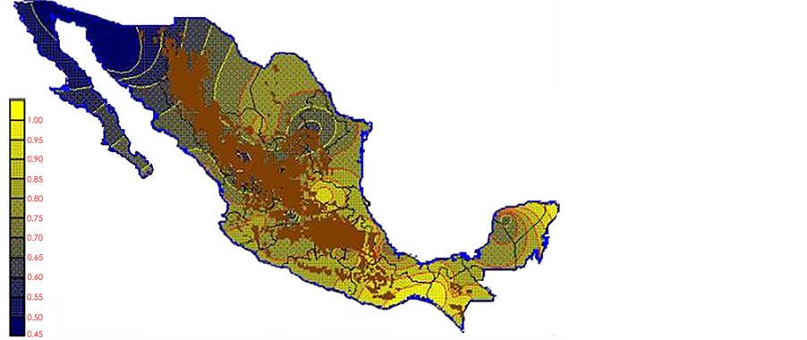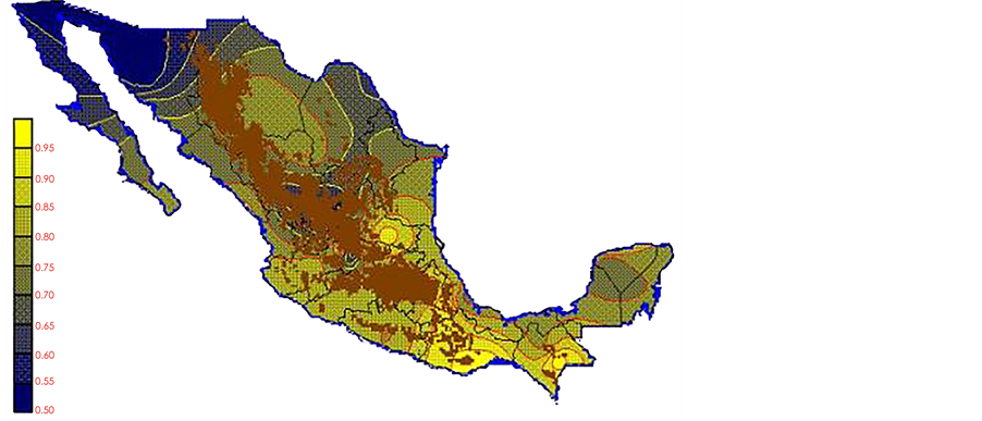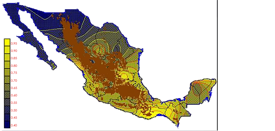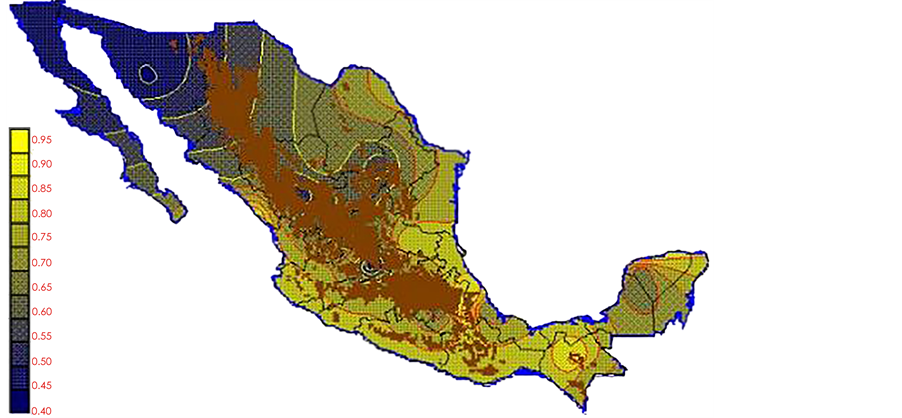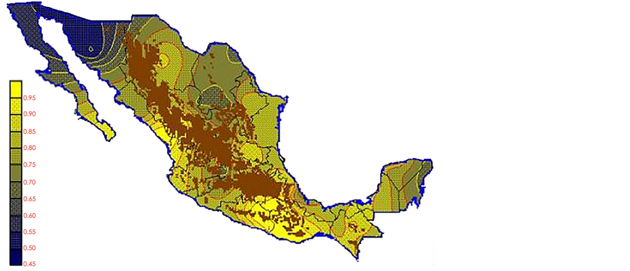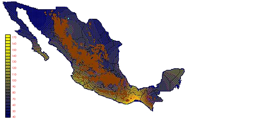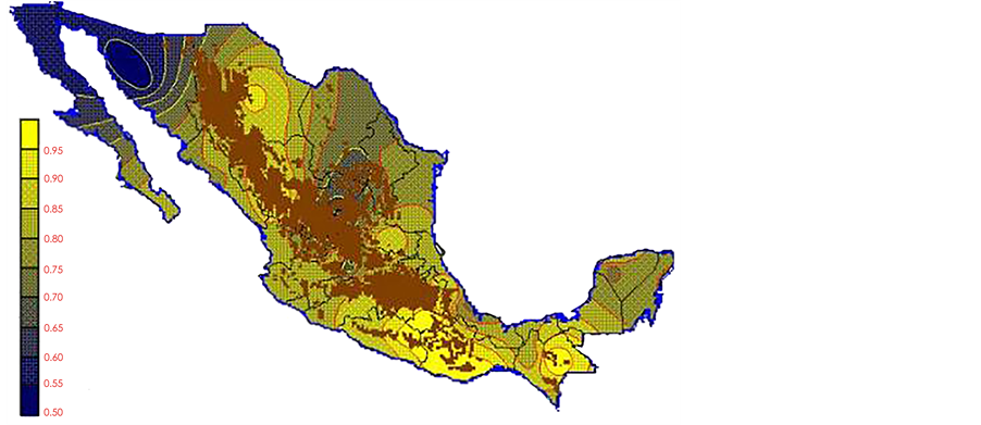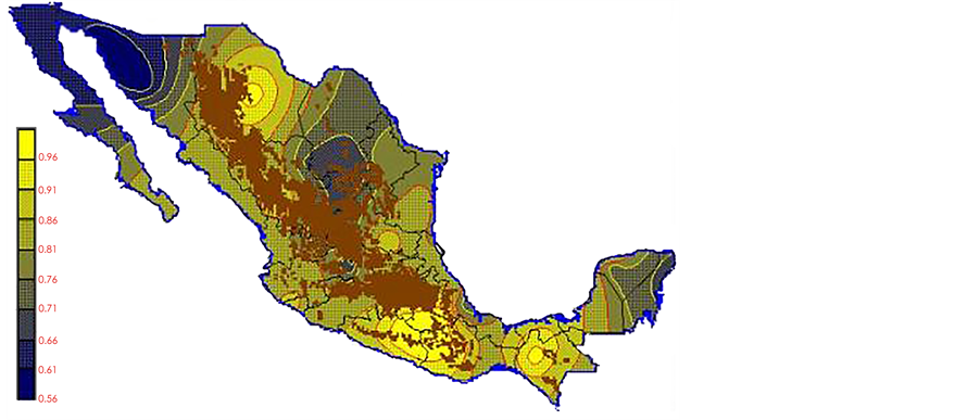 With the values from Table 3, isocurves and maps of Kp pan evaporation and ETo were elaborated and standardized for all the country, by interpolating the latitude, longitude, Kp and ET data respectively (as a triad of values) with a Kringing grid method. With this data, a rectangular calculation mesh (rows and columns) was established. The grid method produces a regulated arrangement of the Z (Kp or ET) values from the XYZ (latitude, longitude and Kp or ET) irregularly spaced. The terms “irregularly spaced” mean that the points do not follow a particular pattern over a map, e.g. in practice many “spaces” were left without any data, which the method (Kringing) estimates by taking as a reference the closest values, filling these spaces by interpolation. The Kringing method has a mean weighed interpolation algorithm and incorporates a linear variogram model. The variogram is used to determine the local vicinity of the observations when an interpolation is performed in each node of the grid. The illustrations Figures 1-12 show the Kp estimations for each month, normalized for Mexico.