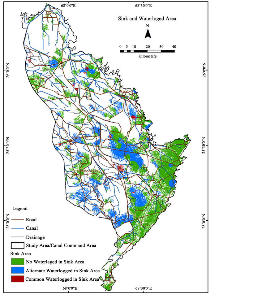 Most of commonly waterlogged areas (pre and post monsoon) were found near built-up infrastructure such as roads. Spatial analysis suggested that artificial sink areas were created due to newly built infrastructure, which caused the artificial waterlogging. The geospatial analysis showed that the trends among the saline areas had been increased in commonly waterlogged areas near the infrastructure. This clearly depicted that there would be unmanaged drainage systems which existed in those particular areas. By using geospatial analysis and its results, we can identify the unmanaged waterlogging caused by the artificial sink. The aggravated soil salinity situation during year 2004 was perhaps due to the poor operation of drainage system in Nara Canal Command area. Waterlogging and salinization can be minimized by managing and improving the drainage system. Geospatial technology can play a vital role in identifying the sink areas which can be created on newly planned infrastructure such as road and canal.