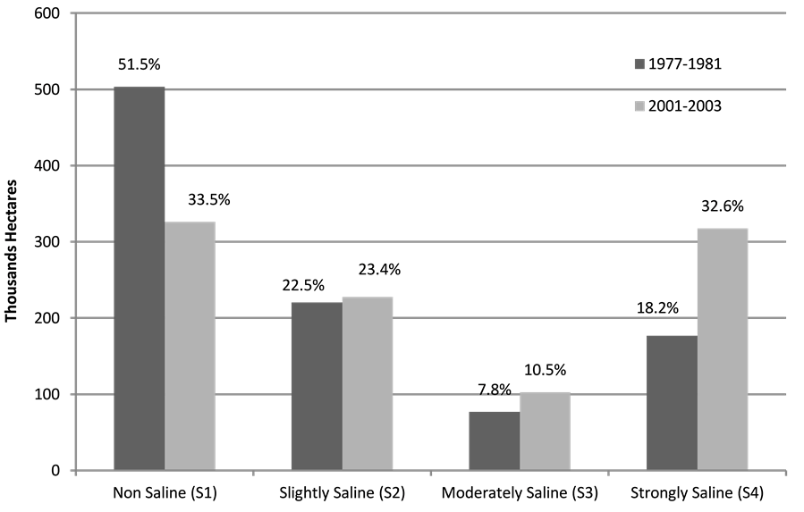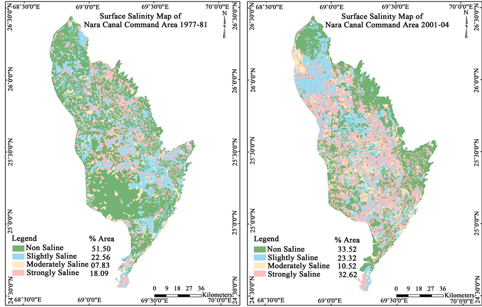 Based on the four surface salinity classes namely: salt free (S1), slightly salt-affected (S2), moderately salt-af- fected (S3), and strongly salt-affected (S4) described earlier, the summary of surface salinity status observed in Nara canal command area during 1981 (Bench Mark), and 2001-03 available surveys in digitally presented in Figure 2.