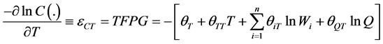 Identifying and quantifying drivers of TFPG require parametric estimation of models with explicit performance factors built into a functional form that captures all technological attributes. A transcendental logarithmic (TL) functional form summarized in Equation (2), is expected to meet these requirements. This functional form is assumed to be a flexible second-order approximation to the industry’s long-run cost function; and is expected to explain the industry’s production technology [7] :