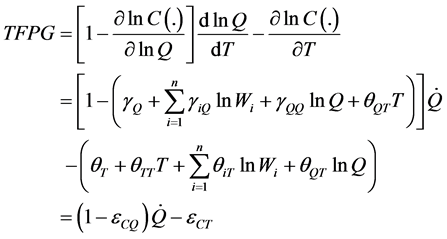 Inferred through its dual measure, the diminution rate of total cost of production, the industry’s TFPG averaged a modest rate of 2.3% per year over the study period. TFPG is considered as one of the engines of economic growth. Its importance is manifested through the fact that “it has become a workhorse of empirical economic growth analysis and that it is a closely watched government statistic” [23] . Its determinants, all of which have important policy implications, include technological progress, improved quality of human and physical capital, effective institutional arrangements, and efficiency of a given management system.