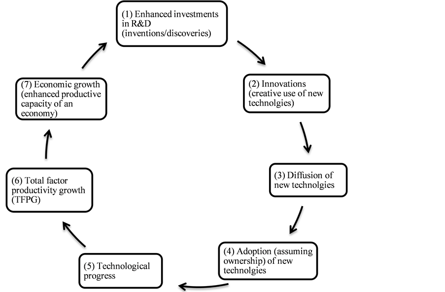 Hypothesis: Enhanced public and private investments in research and development (R&D) lead to human capital accumulation; hence, inventions/discoveries, which eventually lead to technological progress and thereby TFPG, which spurs economic growth [2] . Figure 1 illustrates the logic behind this hypothesis.