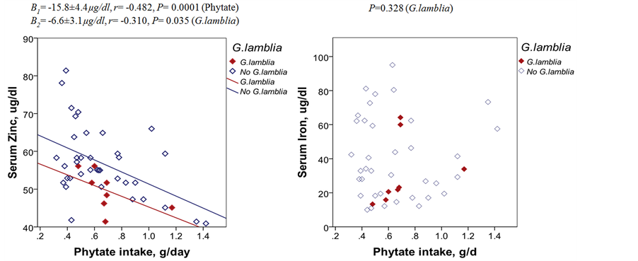 levels of serum zinc and iron respectively. The model indicates that the presence of G. lamblia had a significant negative effect (B = −7.4 ± 3.4 µg/dl, r = −0.310, P = 0.038) on the serum zinc of the children. Serum zinc in children with G. lamblia is 7.4 µg/dl lower than serum zinc in children without this parasite. As has previously been shown, phytate intake also had a significant effect on serum zinc; therefore, a multiple linear regression model was applied to evaluate the extent to which the phytate intake and the presence of G. lamblia effect on serum zinc levels; this model showed that the serum zinc is significantly affected by the phytate intake (B1 = −15.8 ± 4.4 µg/dl, r = −0.482, P = 0.001) and also by the presence of G. lamblia (B2 = −6.6 ± 3.1 µg/dl, r = −0.310, P = 0.035) (Figure 1(a)), indicating that the serum zinc in children is decreased by 15.8 µg/dl for every additional unit of phytate intake. Moreover, the level of zinc in the group of children with G. lamblia is 6.6 µg/dl lower than in the group of children who are free from G. lamblia. There was no significant effect of the presence of G. lamblia on the serum iron of the children (P = 0.328) (Figure 1(b))