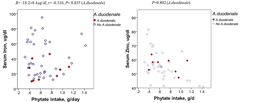 the serum iron in children with A. duodenale is 18.2 µg/dl lower than the level in children who are parasite-free. There was no significant effect on the serum zinc (P = 0.802) (Figure 1(d)). Man-Whitney U test showed that the mean serum iron (24.5 µg/dl) in the group of children with A. duodenale (n = 9) was significantly lower (42.7 µg/dl, P = 0.030) than in the group of children without the parasite (n = 37). There were no significant differences in the levels of iron intake (P = 0.923), phytate intake (P = 0.771), serum zinc (P = 0.372) or serum copper (P = 0.825). Furthermore, no significant differences were found between the nutrient intakes and anthropometric indicators between these two groups. However, significant differences were found in the level of neutrophils (P = 0.012), which was higher in the group of children without the parasite (46%) compared to the children with A. duodenale (38%), and the level of eosinophils was significantly lower (P = 0.008) in the group of children without parasites (21%) compared to the group with A. duodenale (29%).