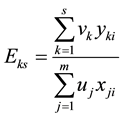 The efficiency score in the presence of multiple input and output factors is defined as: