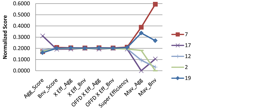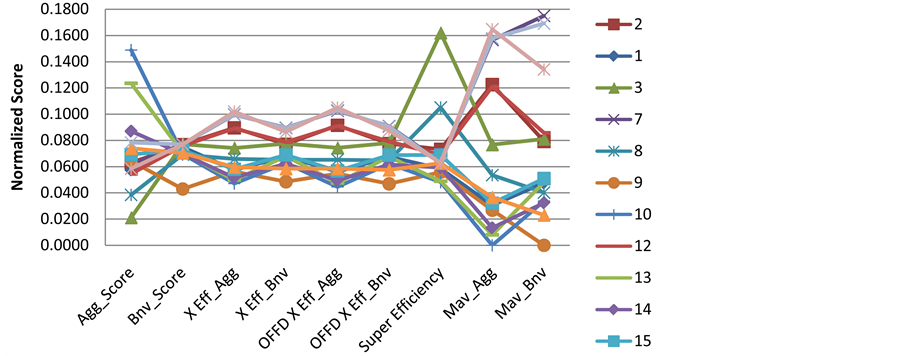 Figure 7. Normalized score for different DEA formulations for efficient projects (2nd set).