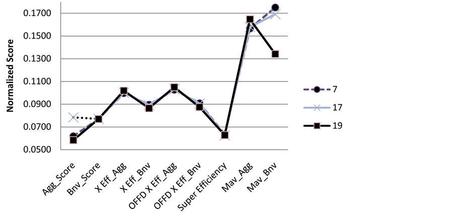 Figure 10. Normalized score for different DEA formulations for efficient projects (3rd set).