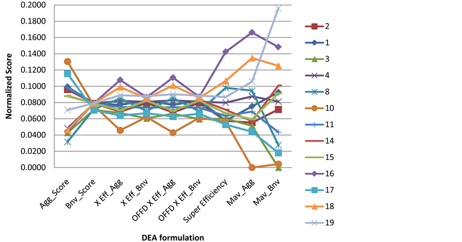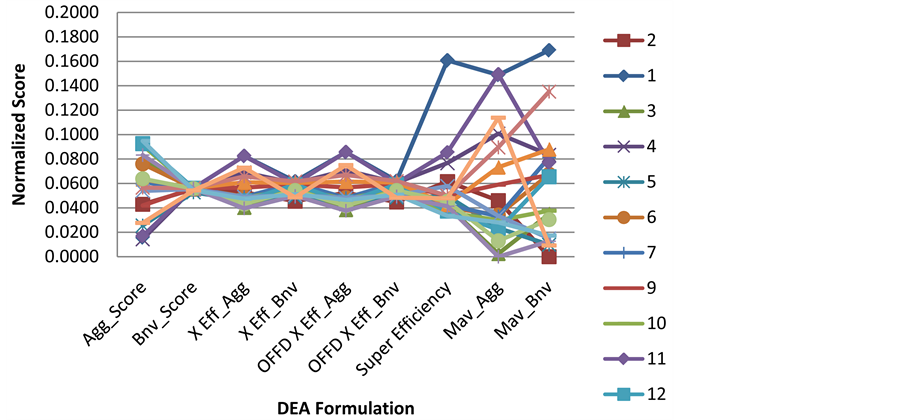 Figure 2. Normalized score for different DEA formulations for efficient projects.