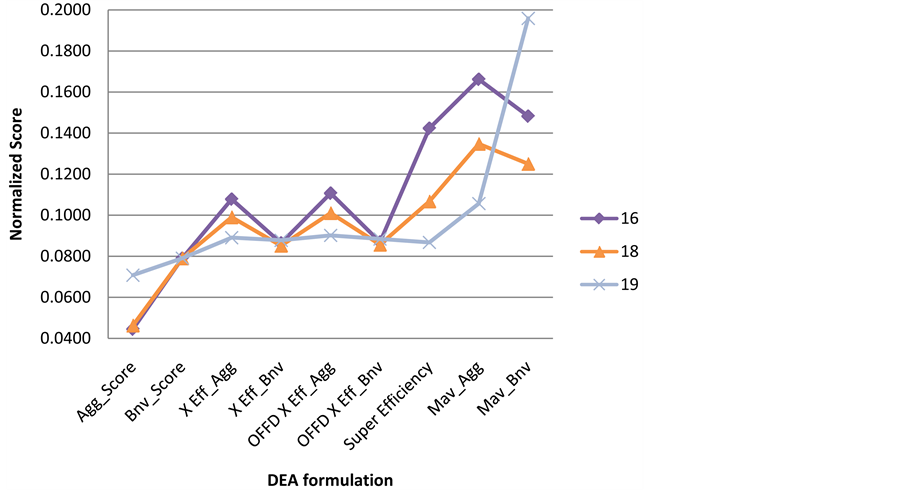 Figure 4. Normalized score for different DEA formulations for efficient projects.