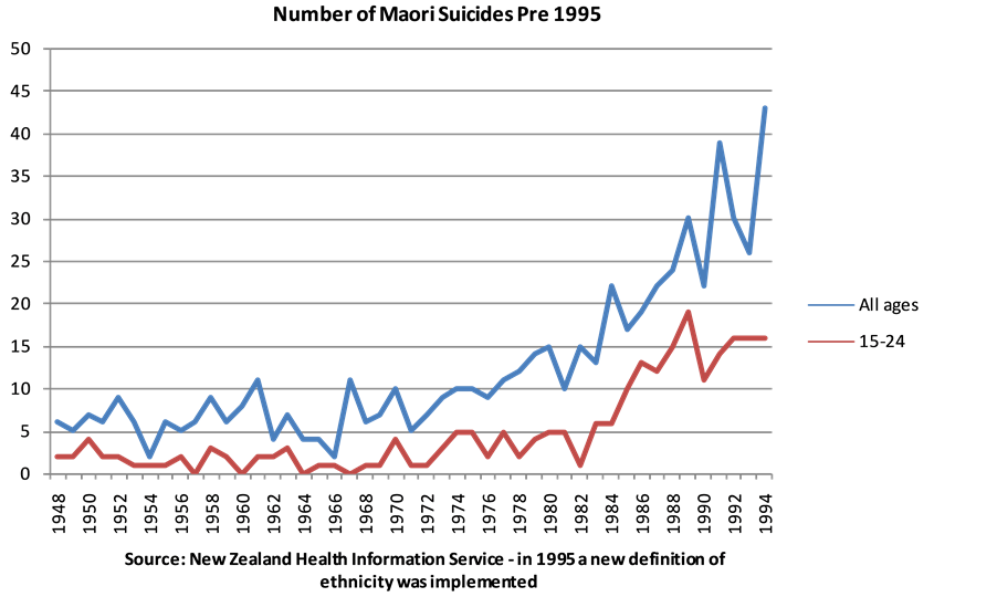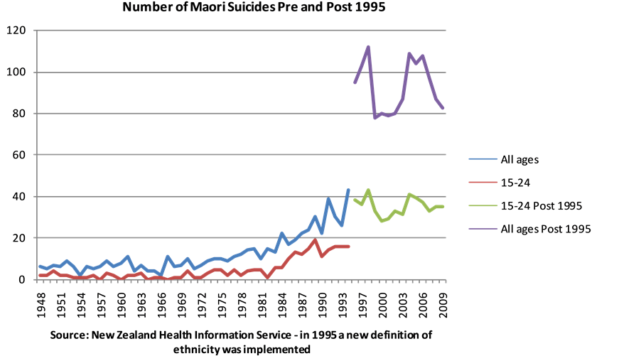 Maori oral history and stories claim that suicide in Maori was unheard of in traditional times before colonisation by the Europeans (TeKaniKingi 2005, http://www.massey.ac.nz/massey/fms/Te%20Mata%20O%20Te%20Tau/Publications%20-%20Te%20Kani/T%20Kingi%20Indigenety%20and%20Maori%20mental%20health.pdf). Certainly, as is shown in Figure 1, the number of deaths by suicide in young people was well under 5 per year since records began until 1974. The number of youth suicide reached 5 in 1974, 75, 77, 80 and 81, but in 1984 the numbers climbed to 6 and continued to increase. The total number of deaths by suicide, however, (Figure 1) went up to 11 as early as 1961. There were two more warnings in 1967 and 1970 when the total number of suicides reached double digits. The increases in suicide should have been heeded as a warning and contingency plans put in place. Clearly, no prevention plans had been adopted since the first warning, and/or, if there were any suicide prevention plans none had worked as from 1973 suicide numbers began to climb reaching 43 deaths in 1993. In 1995 a new definition for ethnic origin(s) was adopted, as a result suicide numbers and rates post 1995 are not comparable with pre 1995 data. However the impact of this change on suicide numbers is quite dramatic, see Figure 2.