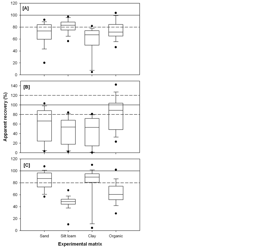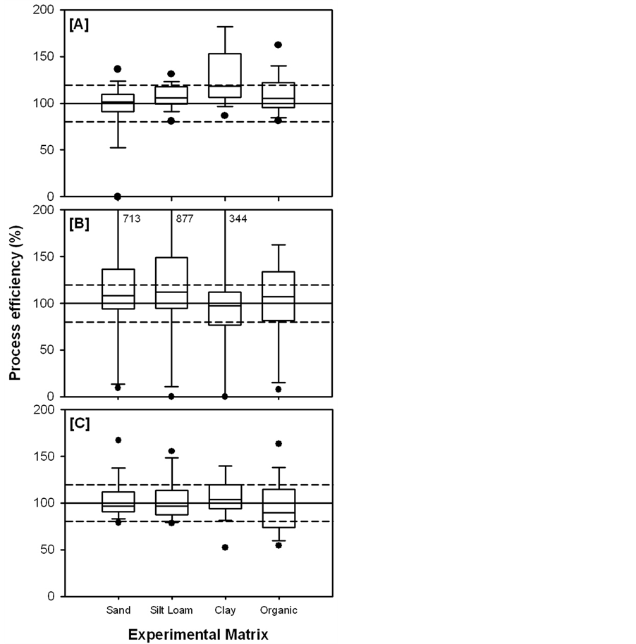 Figure 3. Ranges in the process efficiencies (n = 57) of target analytes spiked into sand, silt loam, clay and organic soil and extracted using ASE (A); Soxhlet (B) and sonication (C).