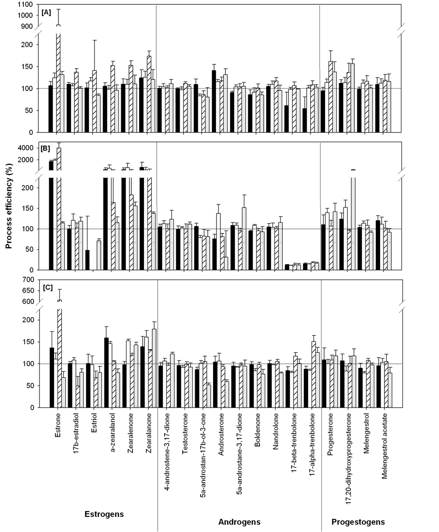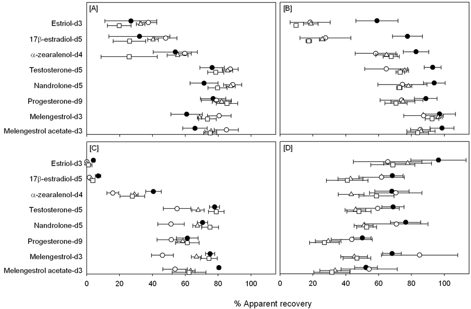 Given the low apparent recoveries of 17β-estradiol and estriol in clay samples, these analytes are excluded from the ranges and averages of apparent recoveries. When 17β-estradiol and estriol are excluded, the apparent recoveries of the remaining target analytes extracted from all soil matrices with ASE ranges from 44.8% (estriol from sand) to 99.9% (estrone from organic) with an overall average of 73% ± 16%. The overall average apparent recovery of sonication (71% ± 23%) was similar to ASE (p > 0.05). The apparent recoveries of target analytes extracted with Soxhlet were highly variable (Figure 1) and resulted in the lowest overall average apparent recovery (58% ± 34%, p < 0.05). The high variability in apparent recoveries of Soxhlet extracts was due to the high recovery of some analytes (i.e., zearalenone, zearalanone and 5α-androstane-3,17-dione) and the low recoveries of others (i.e., 17β-estradiol, estriol, 17β-trenbolone and 17α-trenbolone (Figure 2(B)).