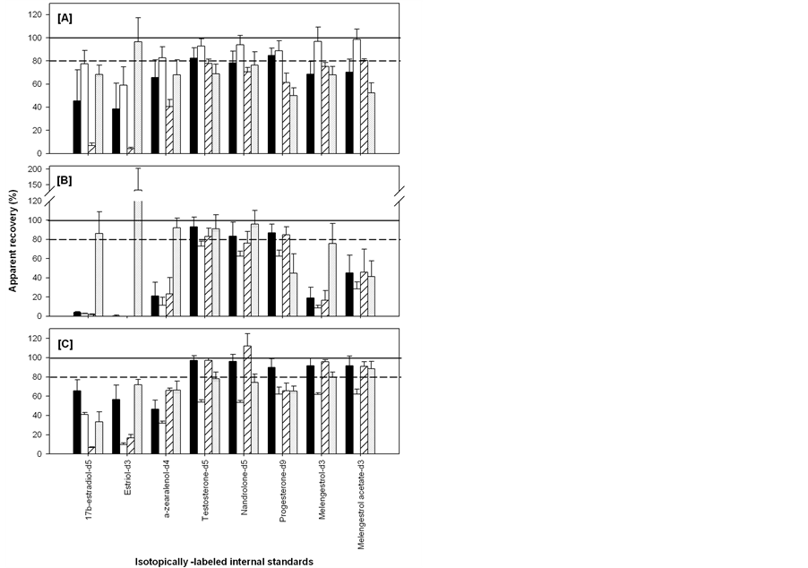 Similar to what was observed with the analyte apparent recovery, the recovery of estriol-d4 and 17β-estradiol-