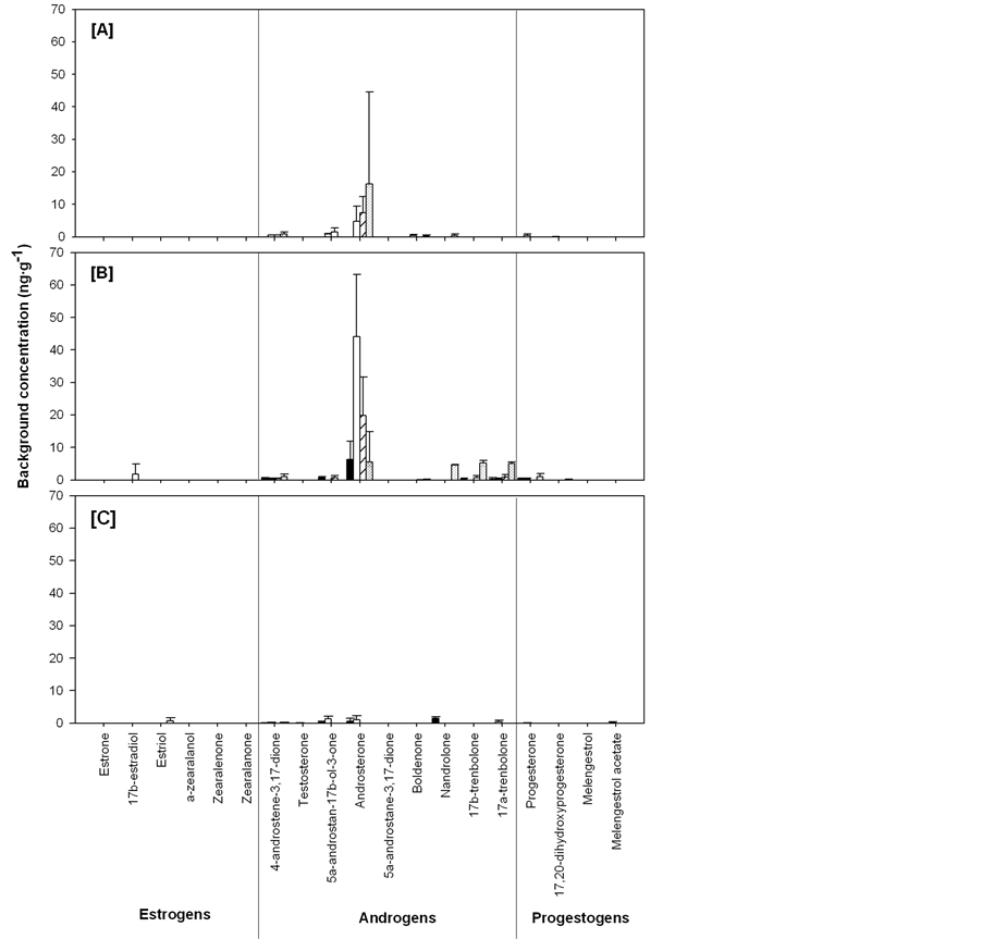 Figure SI.2. Background concentrations in sand (black), silt loam (white), clay (striped) and organic (hatched) soil samples extracted with ASE (A); Soxhlet (B) and sonication (C).