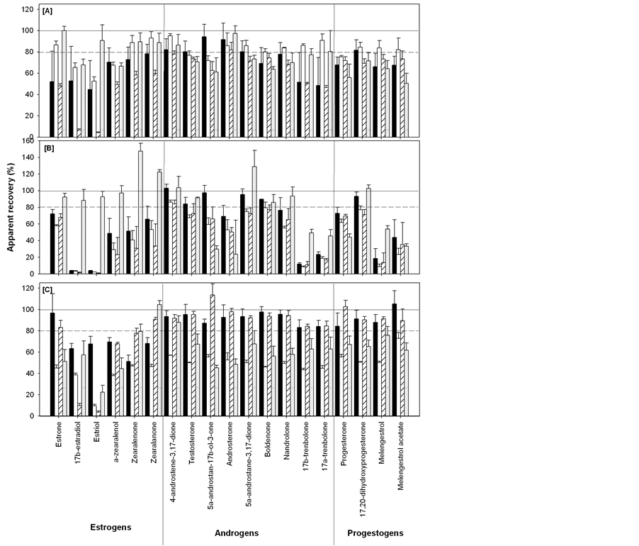 Figure SI.1. Apparent recoveries (average ± standard deviation, n = 3) of isotopically-labeled standards spiked with 50 μL of 10 μg・mL−1 (in methanol) into sand (black), silt loam (white), clay (striped) and organic (hatched) soil and extracted with ASE (A); Soxhlet (B) and sonication (C).