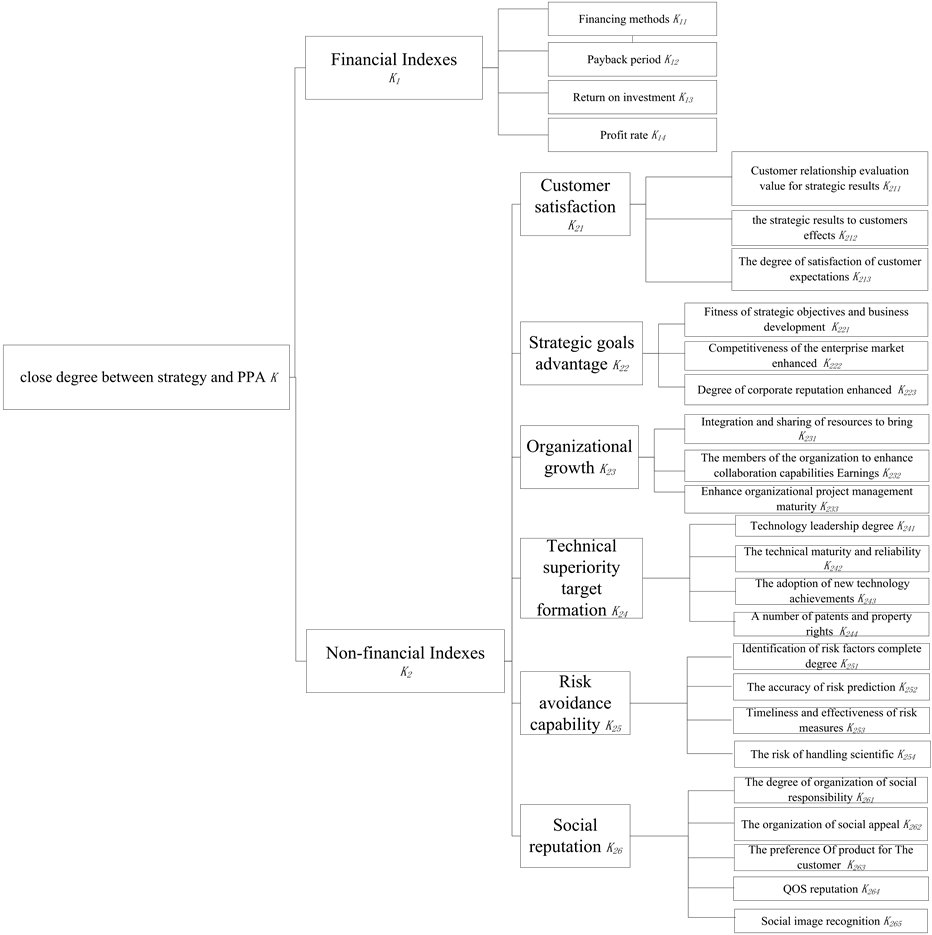 As Figure 2 shows, the strategic target has been divided into financial and non-financial strategic targets. Financial objectives are mainly used to measure the progress of achieving strategic objectives and are familiar to managers. However, using the financial indexes only is insufficient. It is necessary to use non-financial indexes for auxiliary measurement and calculation. There are lots of non-financial indexes used to measure the degree organization’s strategic objectives achieved. We can group the non-financial indexes into six categories [16] : customer satisfaction, strategic goals advantage, organizational growth, technical superiority target formation, risk avoidance capability and social reputation. On the basis of these categories, this paper incorporates strategy into the area of evaluation indexes. Subdividing the non-financial indexes into this sub-index according to the management indexes by Standardization Project Management Institute [17] , we obtain the system of evaluation indexes of the degree of closeness between strategy and PPA, as shown in Table 1.