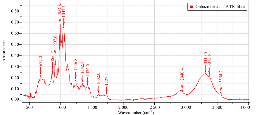These results were similar to that obtained in the Fourier Transformer Infrared Spectroscopy (FTIR). The spectra showed bands mainly related to sucrose, and little intervention of lignin in the case of bagasse; impregnation did not alter the natural sample, so it was possible to conclude that the acid used for impregnation was a convenient medium.