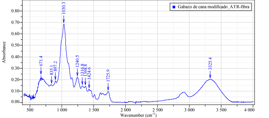 It required 80 - 100 pieces approximately 60 cm long of sugarcane bagasse to obtain only 250 g of solid material corresponding to each of the samples; 10 mg used to conduct the characterization procedure. Subsequently, the chemical modification of the organic material (sugarcane bagasse) carried out using 0.80% of H3PO4 acid for impregnation. Finally, the characterization tests of both natural and modified materials, performed. In relation to the characterization, micrographs of the morphology of the sugarcane bagasse, natural and modified, obtained using a Scanning Electron Microscope (SEM) Quanta 3D FEG (FEI). Then, Fourier Transformer Infrared Spectroscopy (FTIR) used to identify the elucidation of functional groups present in the molecular structures of sugarcane bagasse in both, natural and modified states, an IR2 module of infrared spectroscopy used by Illiminat Fourier Transform IR from Horiba JobinYvon coupled to a micro-Raman confocal spectrometer Labram HR800 from Horiba Jobin Yvon. Finally, the X-ray diffraction performed on a Rigaku Miniflex 600 equipment.