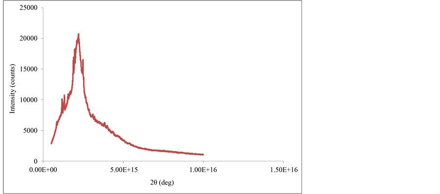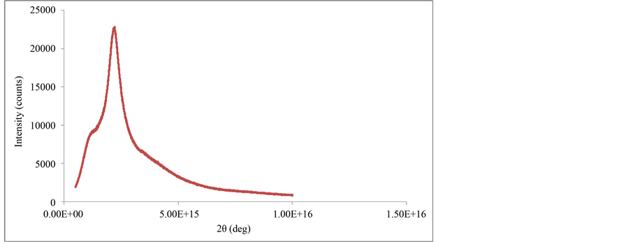 Figure 5 and Figure 6 show the X-ray diffractograms of natural and modified sugarcane bagasse, respectively. The first graph (Figure 5) shows characteristic peaks of a phenomenon of forced dispersal by electrons scattering the X-rays in all directions. However, (Figure 6) shows a uniform diffractogram with only one characteristic peak, which indicate that there is a widening of the material due to the possible presence of small crystals. In general, with a smaller crystal size there will be much wider diffraction peaks.