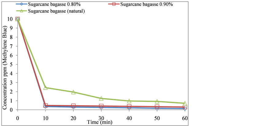 In accordance to the sugarcane bagasse results obtained as bio-absorbent, it proved with an azo compound (methylene blue) in aqueous medium, with an initial concentration of 10 ppm. The best results obtained with 0.80% of phosphoric acid (98.65% adsorption). Figure 7 shows the sugarcane bagasse with the same acid, showing that its efficiency is very good and similar to those results reached in other research work [31] , using the same concentration of dye in 30 min time with the biomass Morinda citrifolia (L.).
