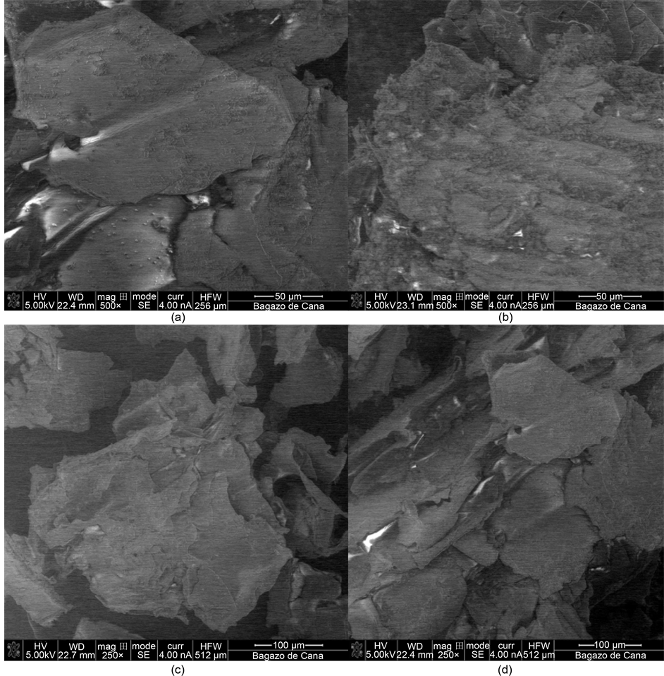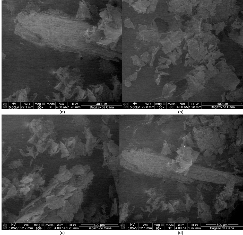 Figure 2. (a)-(d) SEM micrographs of the natural sugarcane bagasse (50 - 100 µm).