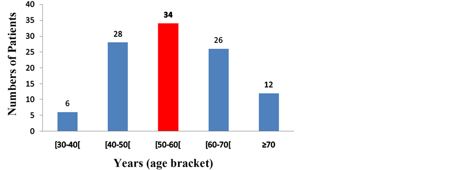 The average age of patients was 55 ± 10.4 with extremes of 31 and 80 years. The average age of women was 54.1 ± 10.0 years; for men it was 61.7 ± 12.2 years (p < 0.05). Figure 1 shows the distribution of patients by age group.
