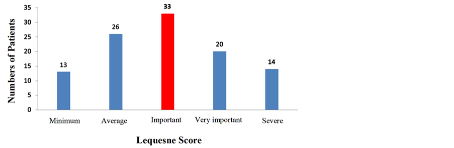 Lequesne average score was 9.1 ± 3.6 with a range of 0 to 18. Sixty-seven patients (63.2%) had a score of Lequesne than or equal to 8. Figure 2 shows the distribution of patients according to the Lequesne score.