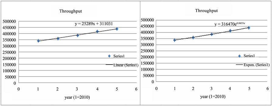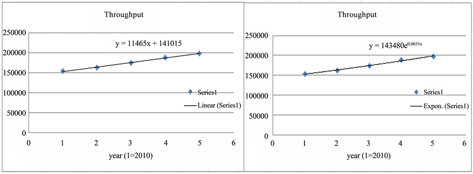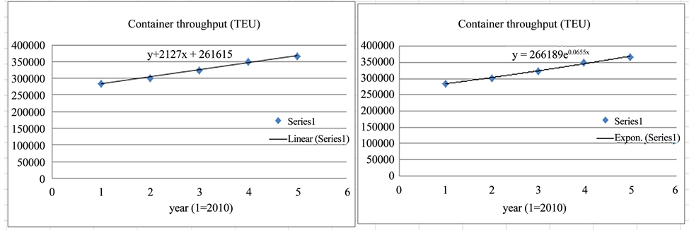 The equation for the curve for the exponential trend line for Cameroon gave y = 266189e0.0655x. This implies that the container throughput increases by approximately 6.5% per year. The exponential trend line and its y value apply the same way for the other countries. Measuring the goodness-of-fit, the mean absolute percentage errors of the two lines give 0.63% and 0.52% respectively for the linear and exponential line. On average, the exponential line is off by 0.52% while the linear line is off by 0.63%. Hence, the exponential curve was used to determine the demand forecasts. From the demand forecast, Congo has the highest demand followed by Cameroon and lastly Gabon. Equatorial Guinea does not have any demand forecast. This means that the port of Congo attracts more container throughput than the other ports.