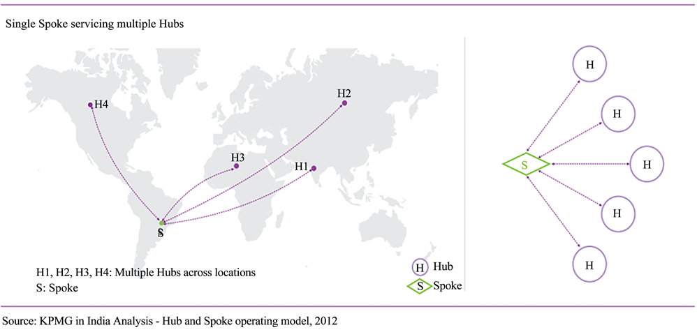 This model is suitable for spokes that are located in areas with specific value propositions such as specific skills, low cost or some culture bond with the client that could be suitable for a particular hub and no other. This model can also be advantageous where a spoke is expected to carry out low skilled tasks [24] .