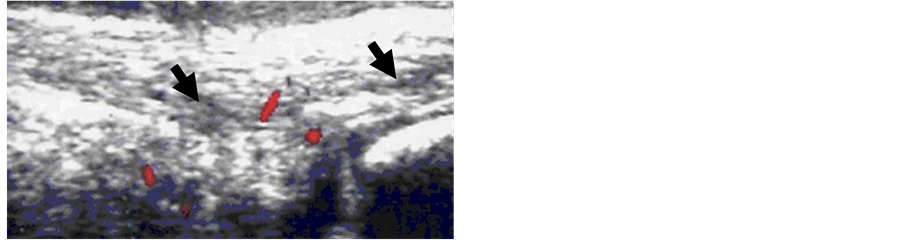 Figure 1. Group A, before treatment: diffuse hypoechogenicity areas (arrows) and thickening of the tendon with intense paratendon microvascularity.