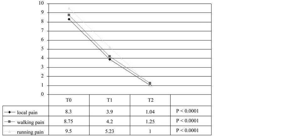At T1 a significant reduction of the pain at rest, during walking and running in 58.3 % of group A subjects (7 out of 12) was evident, this percentage increased to 83.3% (10 out of 12) at T2 (P < 0.0001) (Figure 3).