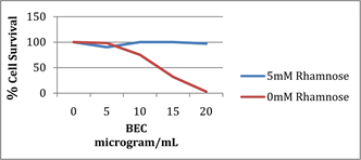 Competitive inhibition studies of BEC with rhamnose in cancer cells have revealed the importance of the presence of unbound rhamnose in formulations. For example, Figure 6 shows that increasing concentrations of BEC resulted in decreasing melanoma cell survival, with ED50 of 12 microgram/mL of BEC and LD100 of approximately 20 microgram/mL of BEC. When 5 mM rhamnose is co-administered with the BEC to the melanoma cancer cells, virtually all the melanoma cells survived [6] [9] [28] .