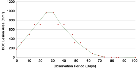 Figure 9. CuradermBEC5 therapy caused an immediate change in BCC lesion size and after 30 days treatment, peaked at over a 4-fold increase in size. Continuous treatment after 30 days resulted in a decrease in lesion size and complete removal of the BCC was attained after 86 days of CuradermBEC5 therapy [57] .
