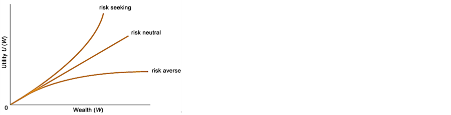 People make investment decisions based on the returns expected to be accrued to them. However, investors’ expectations are sometimes not materialized as they may receive returns less than expected or the actual amount realized may be less than the initial investment. This unrealized expectation constitutes what is referred to in financial parlance as investment risk ( Maranjian, 2013 ). ( Baker et al., 1977 ) argue that investors behave rationally, taking into account the investment’s risk/return tradeoff. There tend to be positive correlation between risks and returns in actuality, however people often perceive that the opposite relationship exists ( Fischhoff et al., 1978 ; Akami & Slovic, 1994 ; Ganzach, 2000 ; Hung et al., 2010 ). The portfolio theory of ( Markowitz, 1952 ) cited by ( Rezagholizadeh et al., 2013 ) posit that investors attempt to maximize the expected return of their investment portfolio for a given amount of portfolio risk, or to minimize risk for a given level of expected return, which means that an investor who wants higher expected returns must accept more risk. That notwithstanding, the level of risk investors are willing to undertake differ from one person to the other which primarily depends on individuals’ attitudes to risk ( Jagongo & Mutswenje, 2014 ; Ishfaq & Anjum, 2015 ). According to ( Farayibi, 2015 ), investors can be categorized into three namely risk averse, risk neutral and risk-seeking. The utility-to-wealth function for each category of investors is depicted in Figure 3.