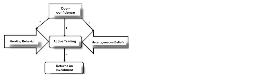Odean, 1999 ) concluded that the more investors trade, the more they reduce their expected returns which is consistent with the prediction that overconfident traders earn less when they engage in active trading. The relationship between overconfidence and active trading illustrated graphically in Figure 5. According to Figure 5, overconfidence of investors leads to decrease in herding behavior. Herding behavior results in investors following or taking the opinions of some group of people into account in their investment decisions. However, overconfident investors are very certain about their own opinions and ignore the opinions of others, thereby reducing their herding behaviors. Overconfidence also results in increase in heterogeneity of investors’ beliefs. The decrease in herding behavior and increase in heterogeneity of investors’ beliefs caused by investors’ overconfidence stimulates active trading which leads to low returns or decrease in returns on investors’ investments.