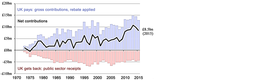 The final results of the referendum held on June 23, 2016 saw 51.9% of voters chose to leave the EU, while 48.1% wanted to remain ( Riley & Long, 2016b ). Prime Minister David Cameron who led the remain-in-EU campaign resigned immediately after the results were released ( Kottasova & Petroff, 2016 ). According to ( Morris, 2013 ), some of the issues which informed voters voting in favor of Brexit are: (i) Eurosceptics believe that trade with EU countries would not be much affected by an exit because UK’s trade deficit with the EU provides enough bargaining power to allow the negotiation of a free trade agreement between the two parties, similar to that enjoyed by Norway or Switzerland; (ii) Britain would be able to expand its trade with non-EU countries through the negotiations of new trade agreements that would not be subjected to constraints imposed by other EU members; (iii) the UK country would be free from the regulatory burden and the costs associated with the EU membership (the EU budget is structured so that the UK consistently contributes a greater proportion of finances than it receives in return ( Baimbridge, 2016 ), for instance, in 2015 the UK government paid £13 billion to the EU budget, and EU spending on the UK was £4.5 billion; therefore, the UK’s “net contribution” was estimated at about £8.5 billion ( Full Fact Team, 2016 ) as depicted in Figure 7). Figure 7 also illustrates the fact that UK has always been contributing more to EU’s budget than what it receives from EU since they joined EU.